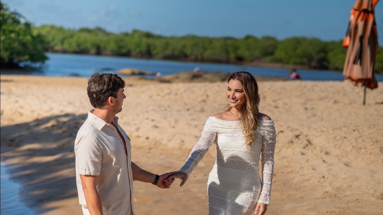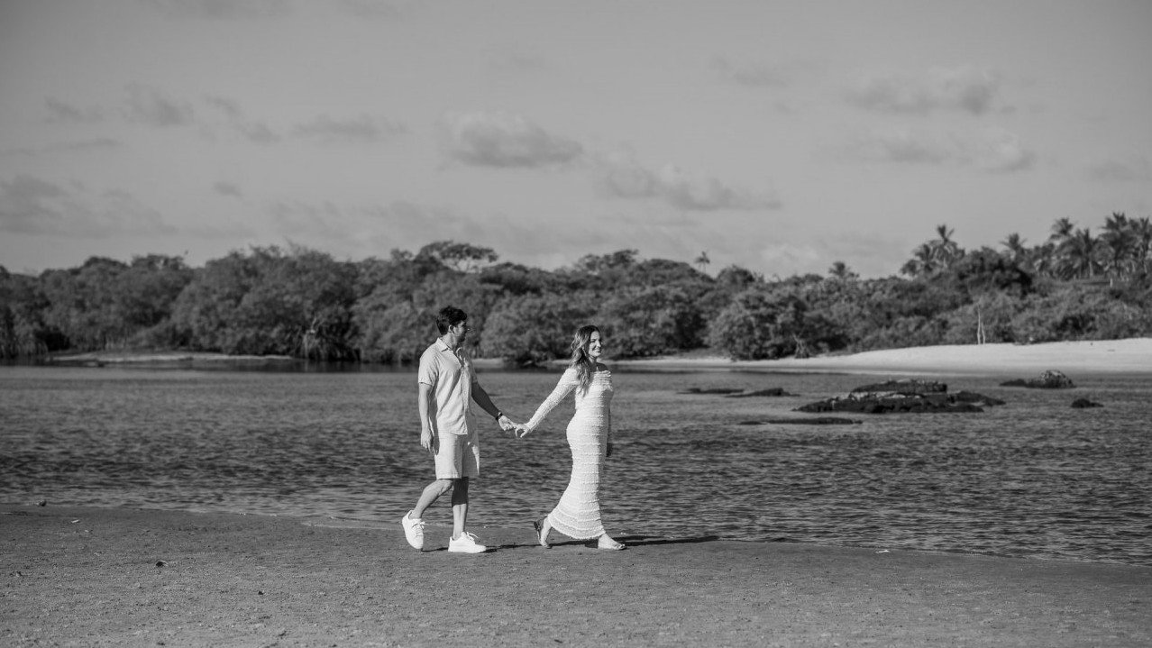 Para o nosso grande dia, à beira-mar, sugerimos traje passeio completo, privilegiando tecidos leves, cores suaves e elegância natural. Para os calçados, indicamos salto bloco ou opções confortáveis, evitando brilho excessivo, em respeito ao cenário e ao conforto de todos.